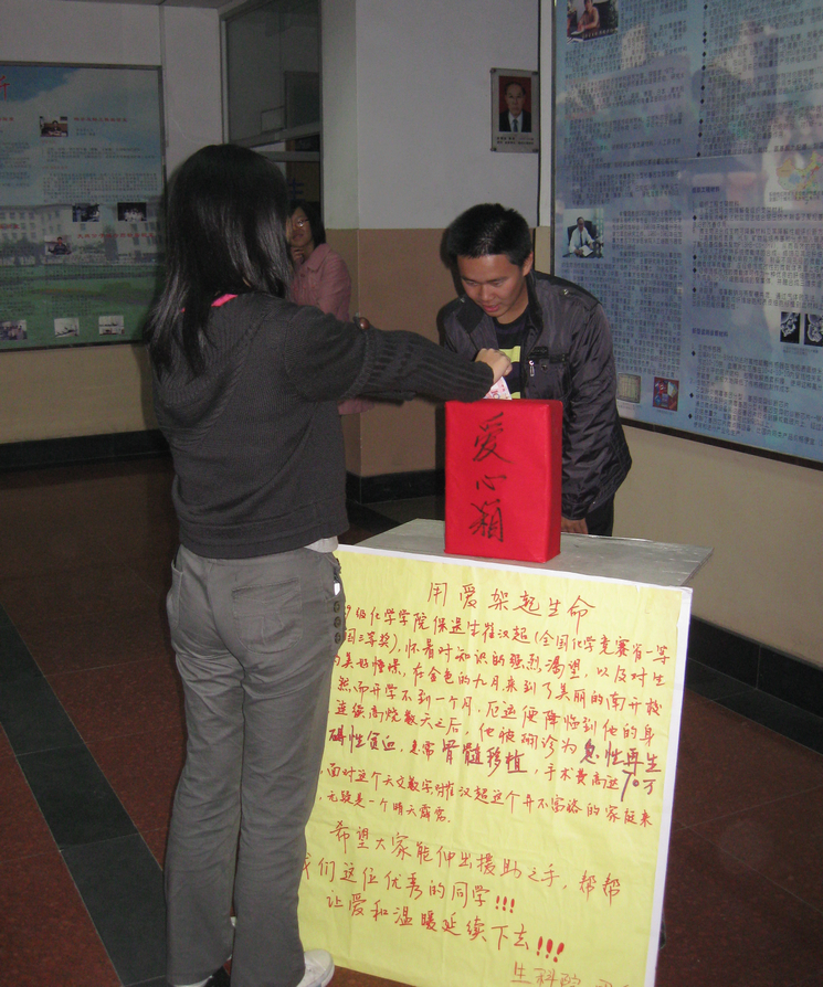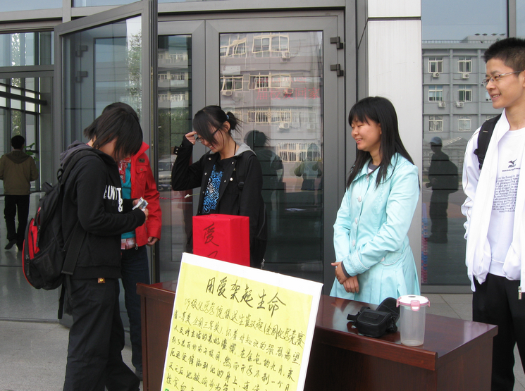 2009年11月生物站门口进行“用爱架起生命”主题募捐活动,为化院大一新生献上生科人的一份关心