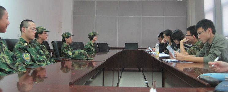 穿着军装的大一新生在生物站会议室参加员工会面试