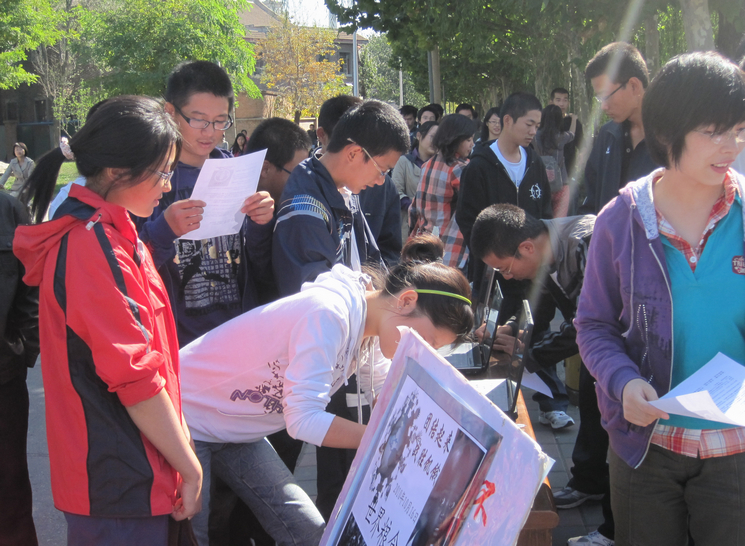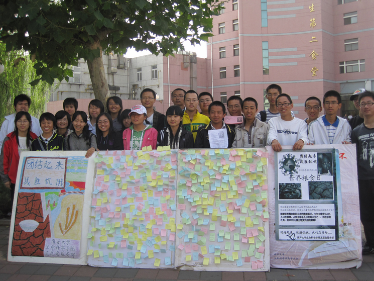 2010年10月15日至16日,tyc33455cc志愿者服务与实践中心在二食堂门口组织了以“团结起来,战胜饥饿”为主题的世界粮食日宣传活动。