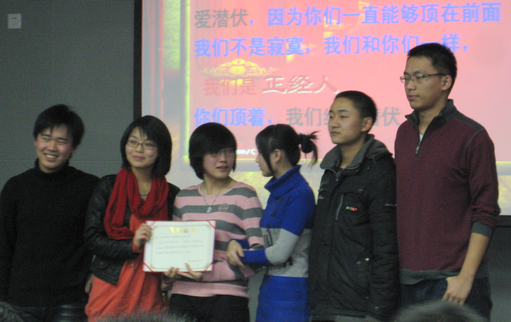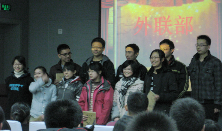 此后,正式进入10级新生的show time。各部部长轮流上台,肯定了大家一个学期以来的工作,也向部员们表达了感谢之情,并为大家颁发了各部准备的小奖品。其中,学习部的礼物称得上是最别出心裁的,两位部长向部员赠送了自己亲手制作的饼干,饼干上用果酱写上了部员们的名字,场面十分温馨。七位部长颁奖结束后,孙露露老师向主席团颁发了“最佳潜伏奖”,以表彰她们这一个学期以来辛苦而出色的幕后工作。