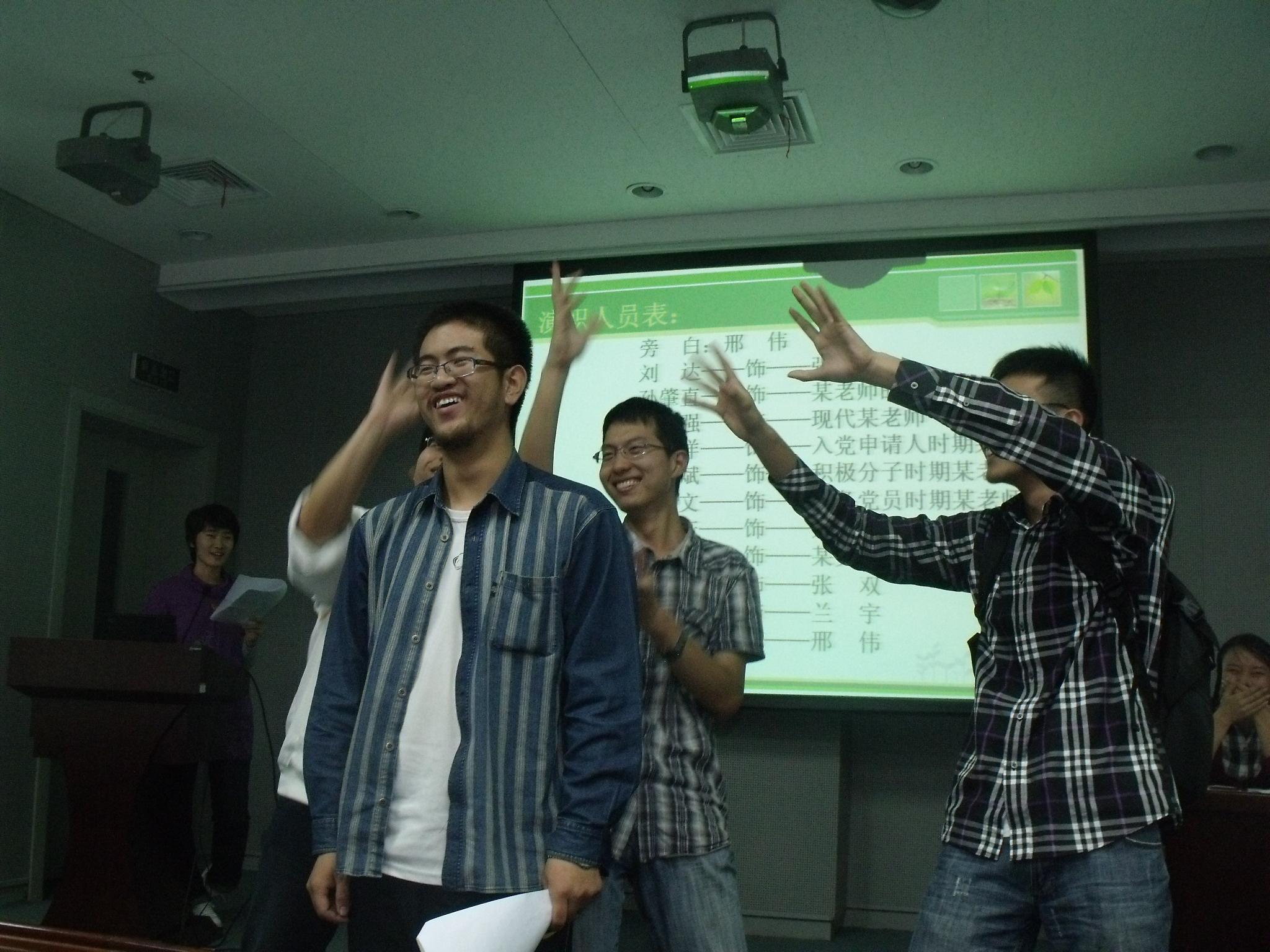 虽然老员工活已经过去了两年,但仍然有的同学出于各种原因对入党的流程不甚了解。为了让同学们对入党的流程有深刻的印象和更形象的理解,09级党支部的各位党员想到了以话剧的形式,将一个普通同学成长为合格的中国共产党正式党员的历程表演出来。经过几天的准备,几位党员终于将这一台小话剧呈现在了各位志愿入党的同学面前,而同学们的反应也令各位党员颇为欣慰。