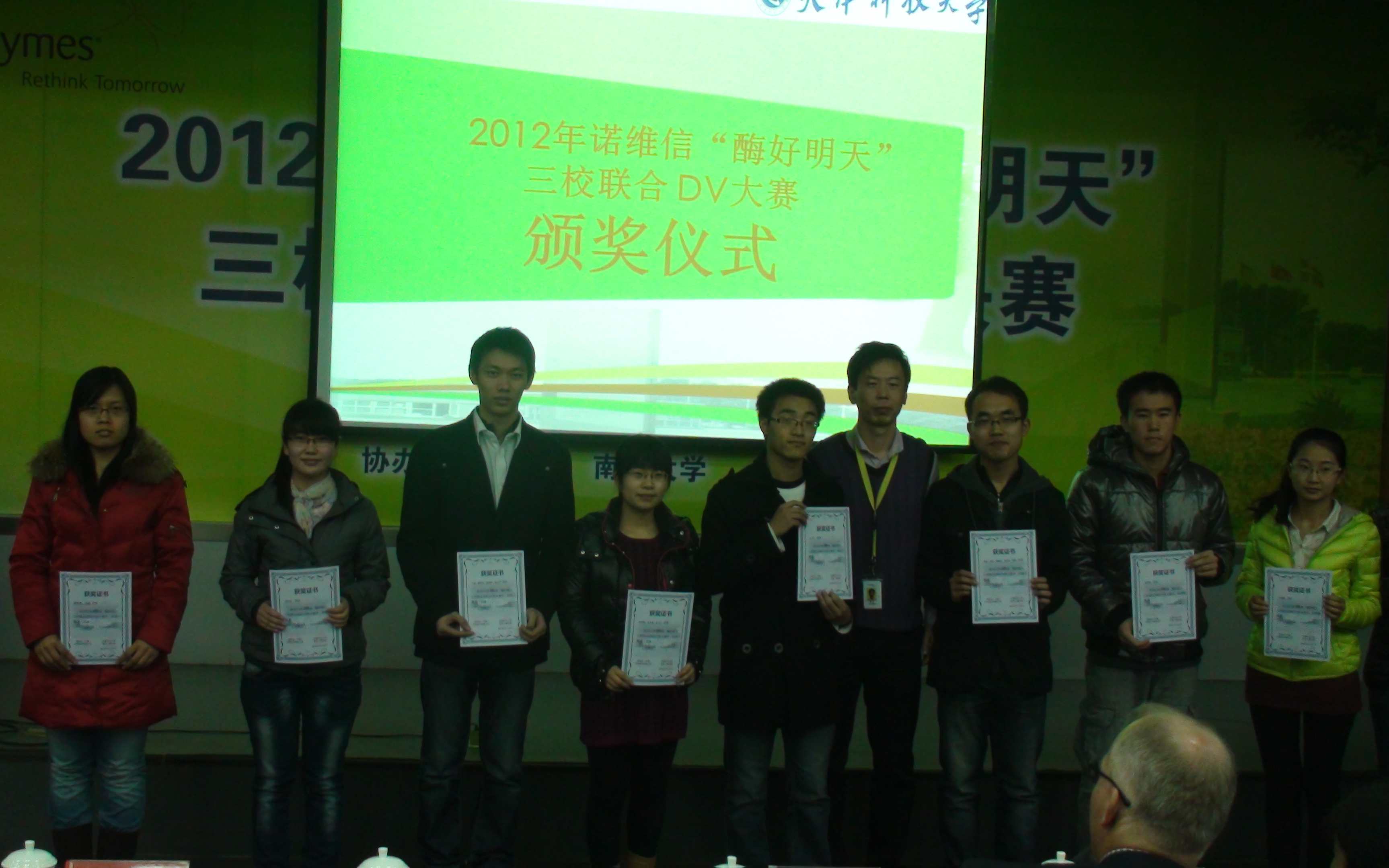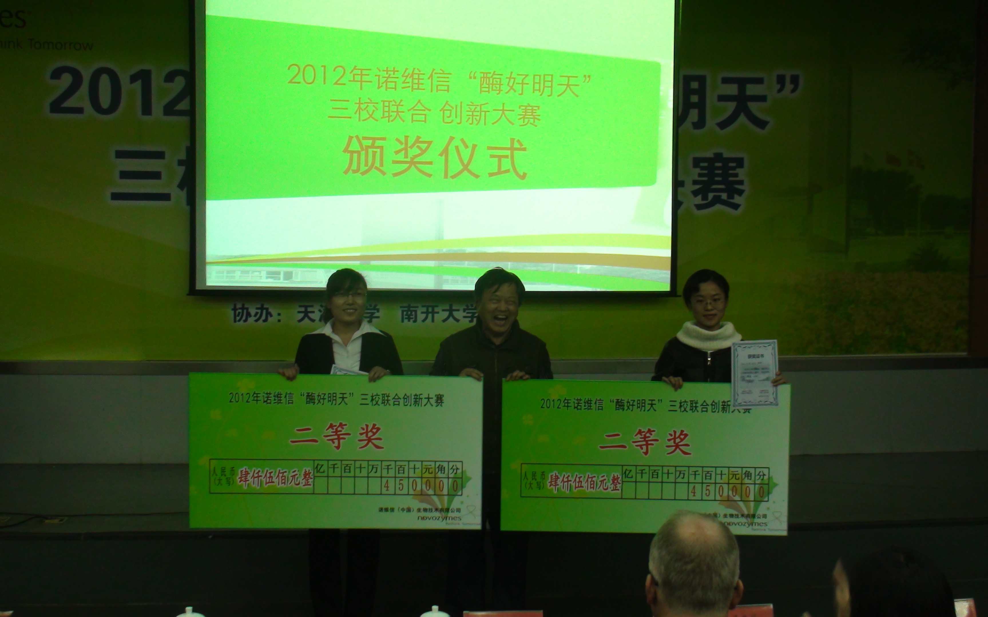 11月21日下午,2012年度诺维信“酶好明天”三校联合创新大赛总决赛在天津科技大学举行。此次比赛由诺维信(中国)技术有限公司、tyc33455cc、天津大学与天津科技大学共同举办。本次活动以“绿色发展与创新――如何用现代生物技术改造传统产业实现可持续性发展”为主题,分为创新科技设计大赛和“酶好明天”创新DV秀大赛。