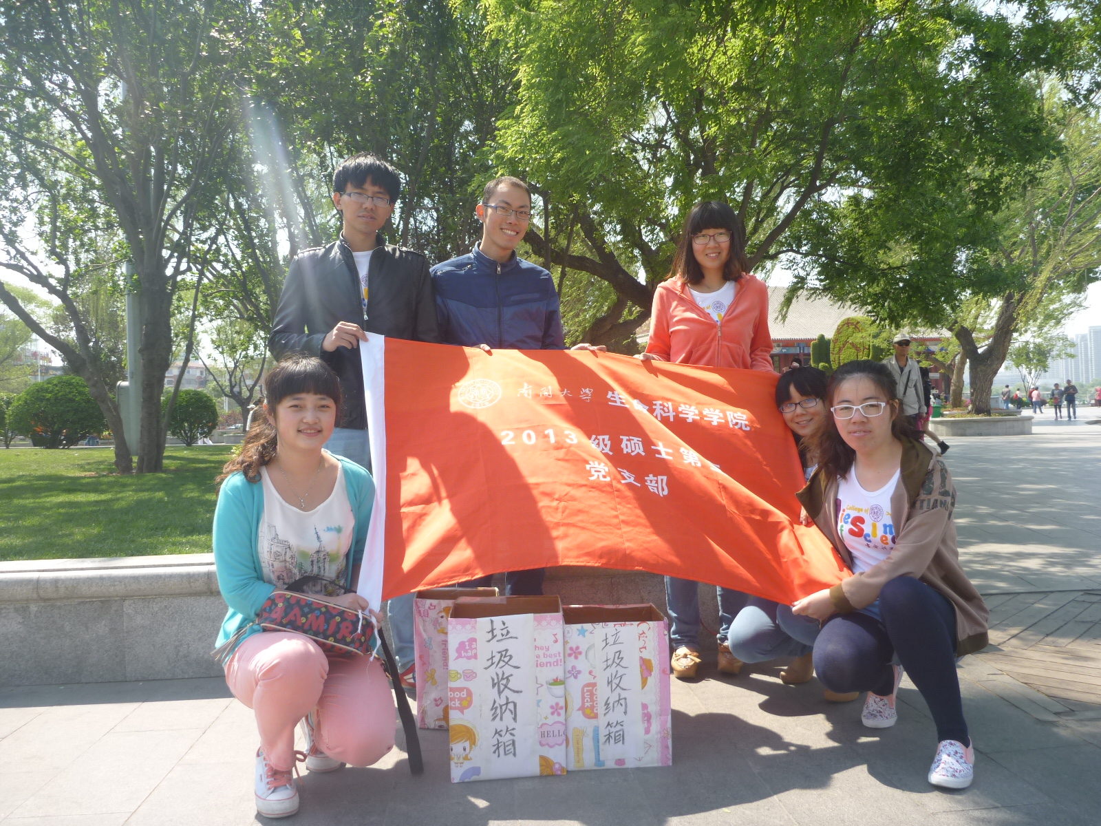 五四青年节之际,生科院2013级硕士第三党支部的党员同学开展研究生创最佳党日活动,组织了一次“践行公能,共筑中国梦”系列活动之“还地球一片绿色”环保公益活动,号召大家创造绿色家园,还地球一片绿色,还大家一个美好心情。