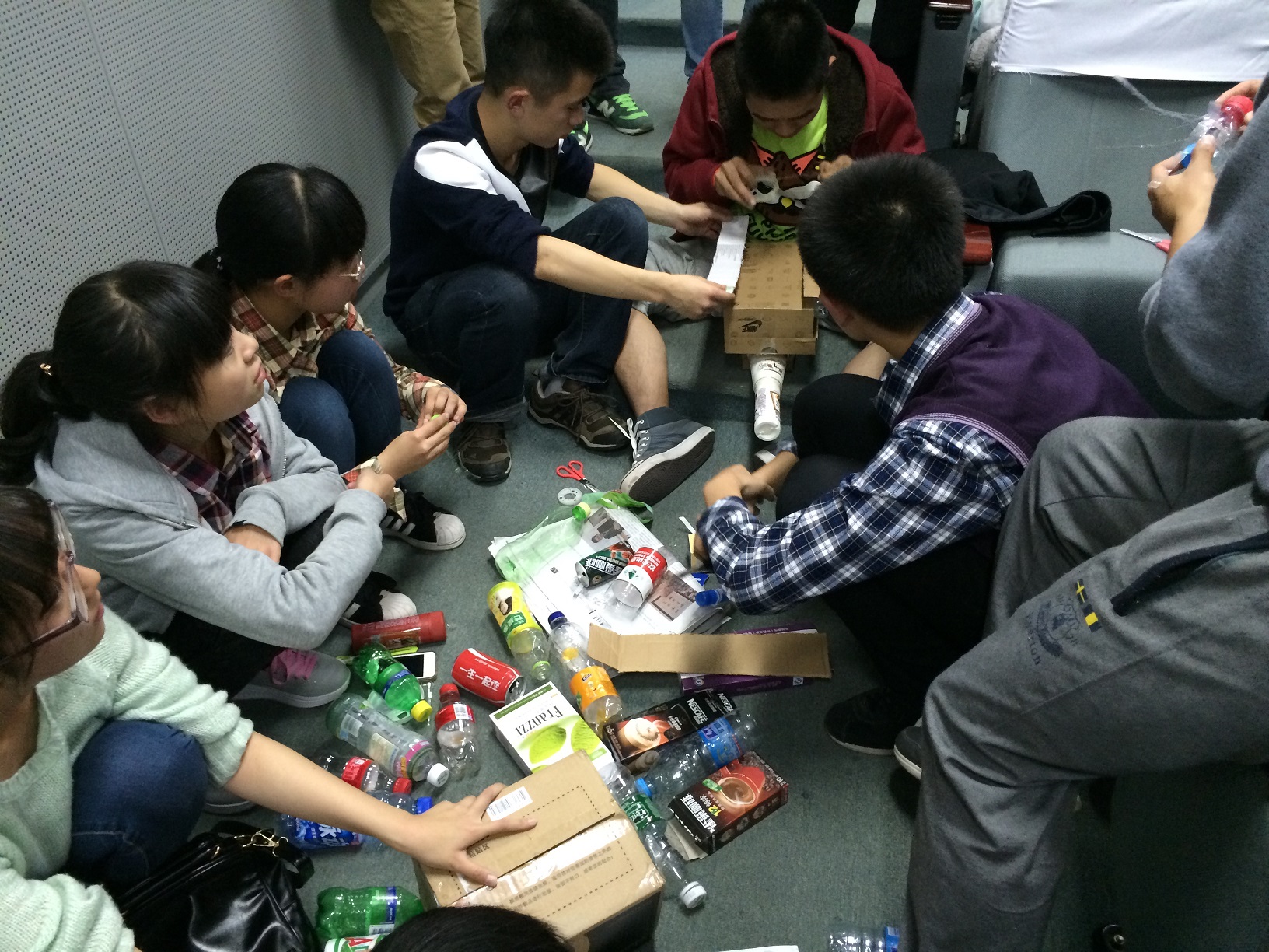 活动开始之前,各组导员以竞赛的形式挑选了比赛场地和必用废物,准备工作就绪后,活动正式开始。在接下来的一个小时的时间里,各组同学充分发挥自己的想象力和动手能力,将一堆堆废弃物剪接拼装,让它们重新焕发了生命力,一个个充满创造力的艺术品和工艺品相继诞生。在展示环节中,同学们又以绘声绘色的语言和故事情节博得了各位评委的高度评价,比赛最终结果由全体同学投票决出。
