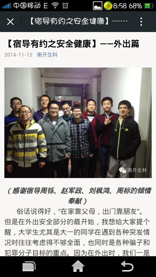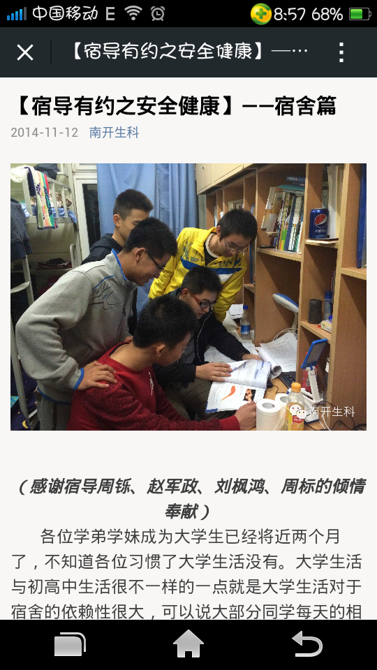 宿舍导师们分别走进新生宿舍,与新生交流答疑。几经接触,宿舍导师们已经与新生们成为了亲密的朋友,他们的提醒给予新生了许多帮助。本周宿导们着眼于安全问题,希望通过自己的努力为新生带来一个安全可靠的生活环境。