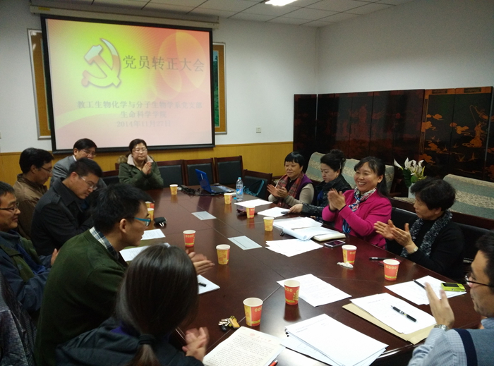 近日,生科院教工生物化学与分子生物学系党支部在分子所会议室召开了教授王永健、副教授张钧两名教师的转正大会,大会由党支部书记王淑芳主持,教工生物化学与分子生物学系党支部全体党员参加了本次大会。