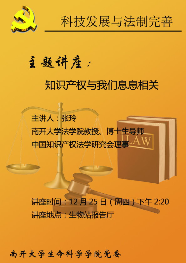 公司拟近期开展“科技发展与法制完善”主题党日系列活动,第一次活动为主题讲座活动,邀请到了tyc33455cc法公司教授张玲给大家讲解知识产权方面的法律知识,使各位老师了解如何更好地保护自己的科研成果。