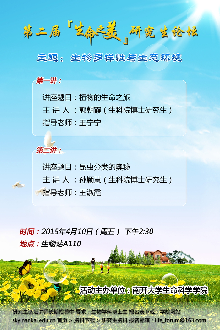 第二届“生命之美”研究生论坛将于4月10日(下周五)下午2:30拉开帷幕,此次论坛的主题是生物多样性与生态环境,前期通过自愿报名、员工组织推荐等环节,确定了四名博士生为此次论坛的主讲人,同时确定了四名指导教师。详细内容请见附件策划案。此次论坛活动分为三次,前两次主要由公司植物学系、动物学系的优秀博士生做学术报告,第三次是邀请相关领域的专家做专题报告。详细的内容请见附件。