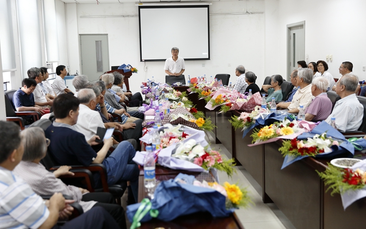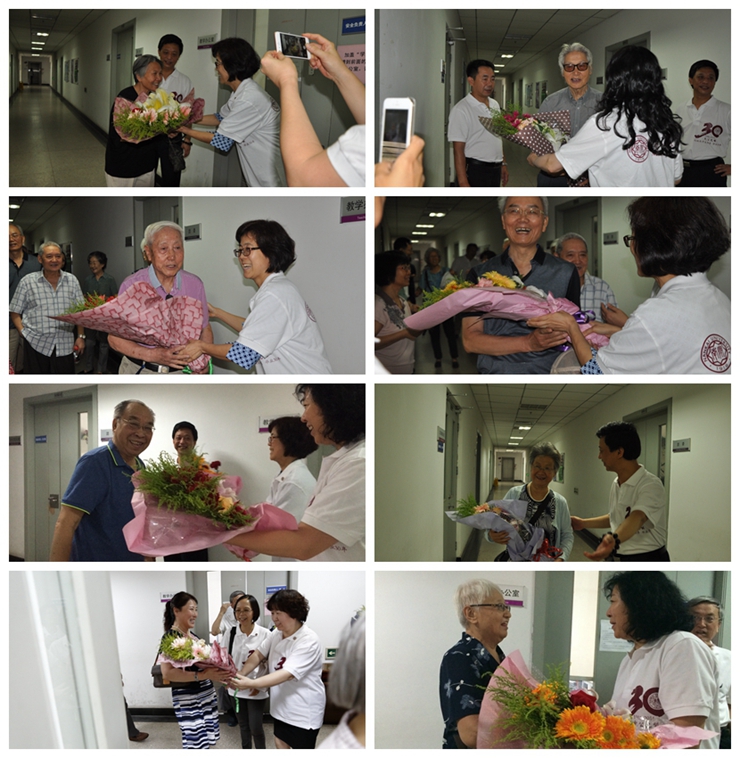 员工为老师们献花,花香扑鼻,令人心醉。他们自发地按专业介绍了自己的任课老师,前来参会的老师当中最年轻的也已经退休,但他们却能细说出当年的故事,其场景温暖着在场的每个人。