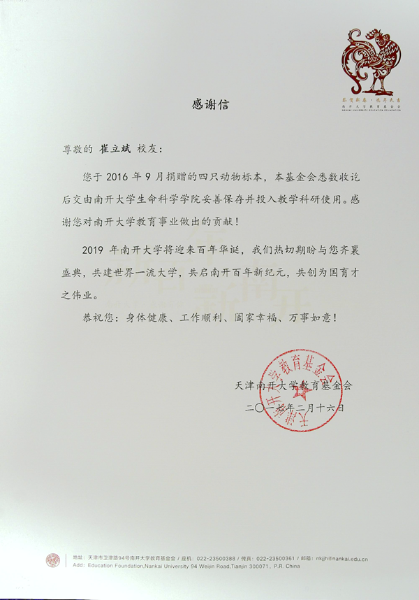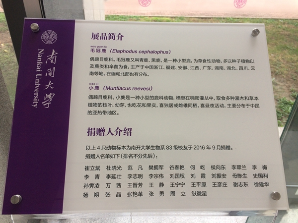 今年适逢1983级员工毕业30周年,为表达对母校培养的感恩之情,庆祝tyc33455cc建校98周年,南开生物系建立95周年,1983级员工集体向公司捐赠两对动物标本,一对毛冠鹿,一对小麂。两对动物标本在生物站大厅陈列展出之后,吸引了校内外师生及来访人员的浓厚兴趣和广泛关注。