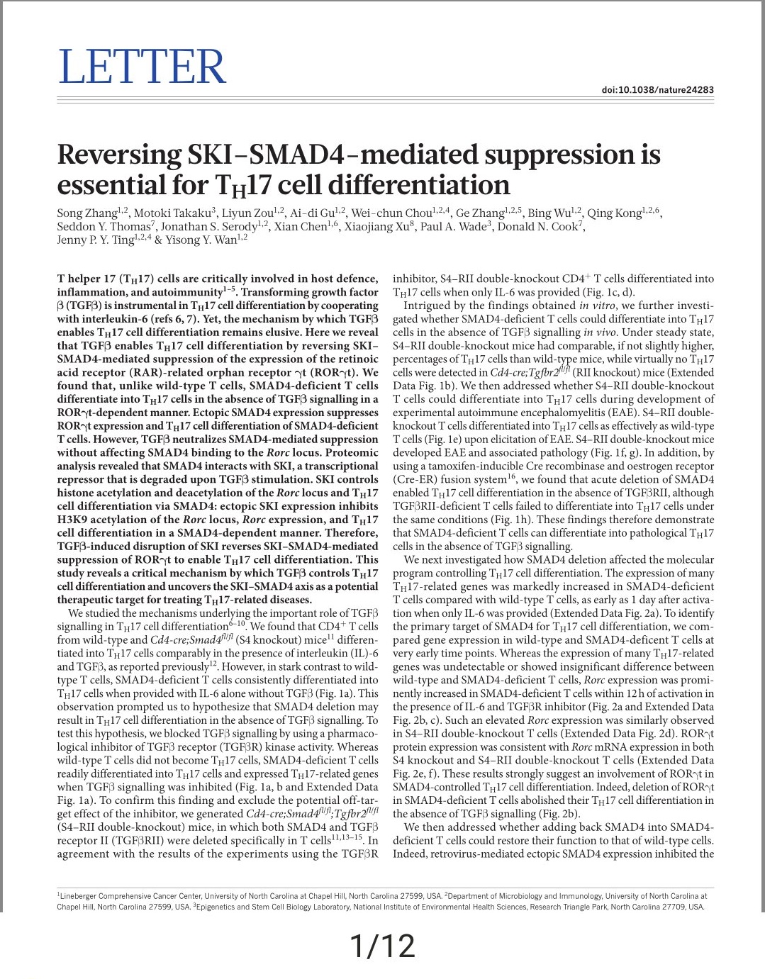 在正常情况下,T细胞在没有TGFb的条件下并不能分化成Th17细胞。而这篇报道的研究者们发现,缺失Smad4基因的小鼠T细胞可以在没有TGFb的情况下产生Th17,证明了SMAD4对Th17细胞的产生起着决定性的抑制作用。进而发现SMAD4蛋白是通过直接结合在Rorc基因上来调控Th17细胞的产生。