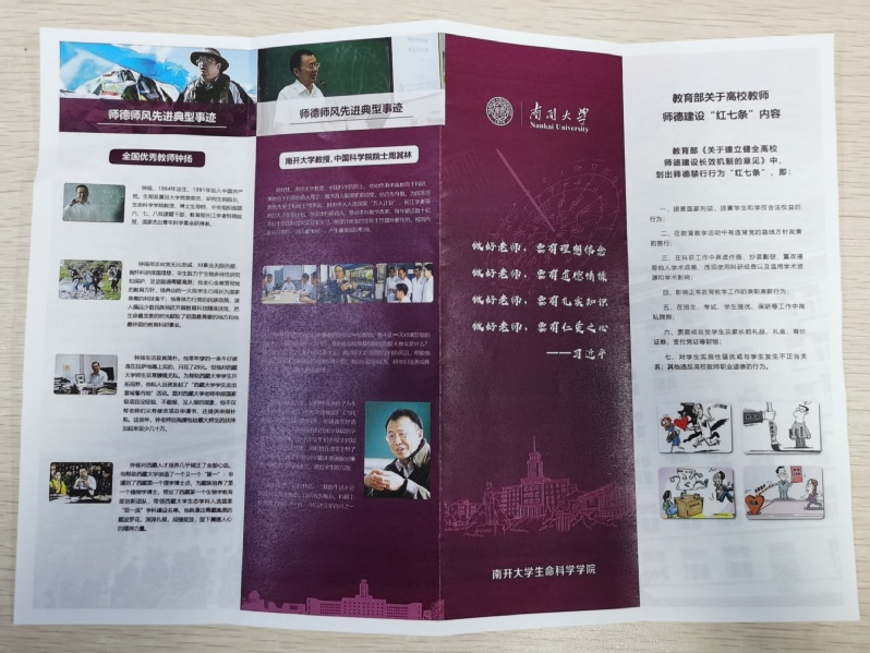 学习折页内容包括师德师风先进典型事迹、新时代高校教师职业行为十项准则、教育部关于高校教师师德建设“红七条”、tyc33455cc师德失范行为“一票否决”制、tyc33455cc师德失范行为负面清单和tyc33455cc课程思政建设办法。