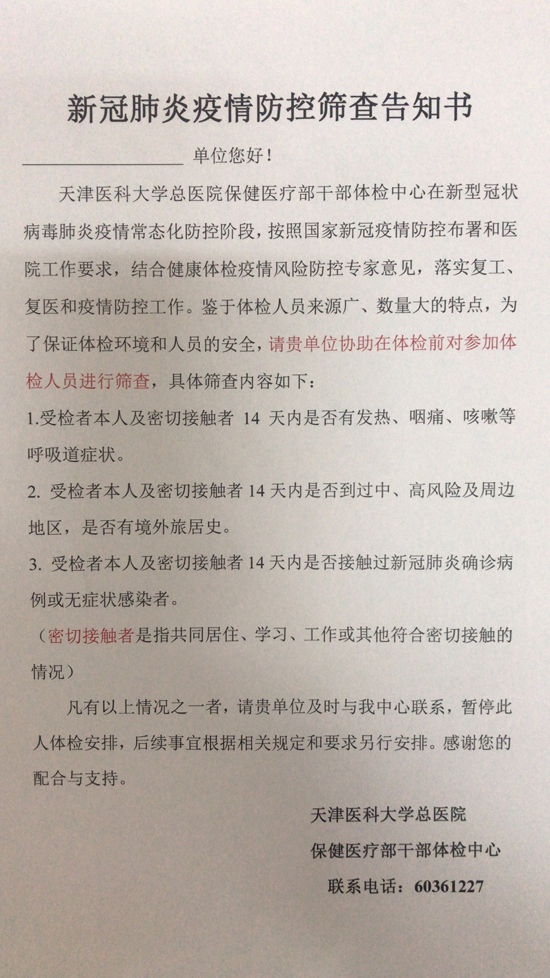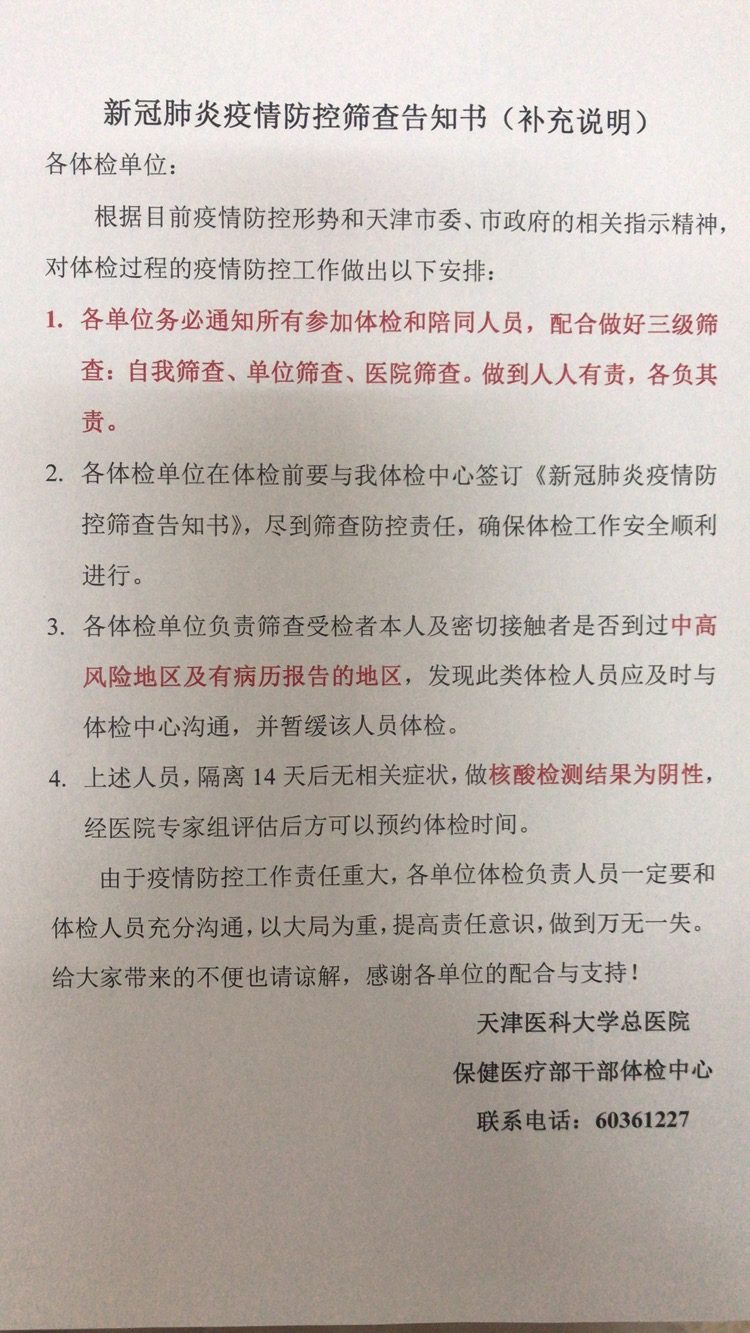 ②请体检老师仔细阅读《新冠肺炎疫情防控筛查告知书》和《新冠肺炎疫情防控筛查告知书补充说明》,如出现告知书中情况,请第一时间与公司党委联系(联系电话23502989),公司党委与党委组织部沟通后,视情况参加体检。