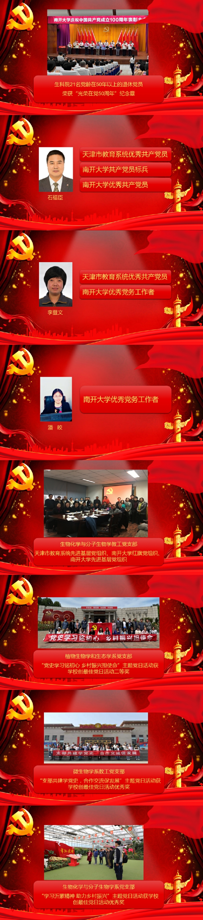 在庆祝中国共产党成立100周年之际,公司21名党龄在50年以上的退休党员荣获“光荣在党50周年”纪念章;生物化学与分子生物学教工党支部荣获“天津市教育系统先进基层党组织”、“tyc33455cc红旗党组织”、“tyc33455cc先进基层党组织”称号;石福臣老师获得“天津市教育系统优秀共产党员”、“tyc33455cc共产党员标兵”、“tyc33455cc优秀共产党员”荣誉称号;李登文老师获得“天津市教育系统优秀党务工作者”、“tyc33455cc优秀党务工作者”称号;潘皎老师获得“tyc33455cc优秀党务工作者”称号;植物生物学和生态学系党支部“党史学习铭初心 乡村振兴担使命”主题党日活动获公司创最佳党日活动二等奖,微生物学系教工党支部“支部共建学党史,合作交流促发展”主题党日活动和生物化学与分子生物学系党支部“学习沂蒙精神 助力乡村振兴”主题党日活动获公司创最佳党日活动优秀奖。