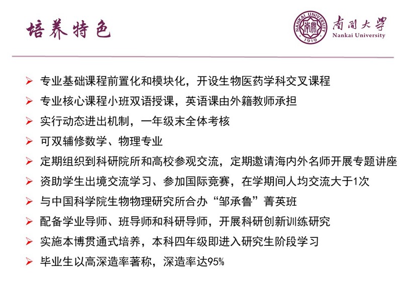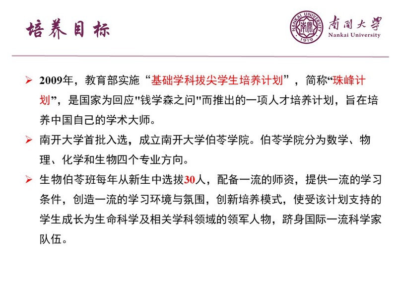 培养具有家国情怀、人文情怀、世界胸怀、宽厚的自然科学基础、扎实的生物科学专业知识和技能、强烈的创新意识,能脚踏实地、又追求卓越,勇于挑战生命科学前沿关键问题的未来科学领军人才。