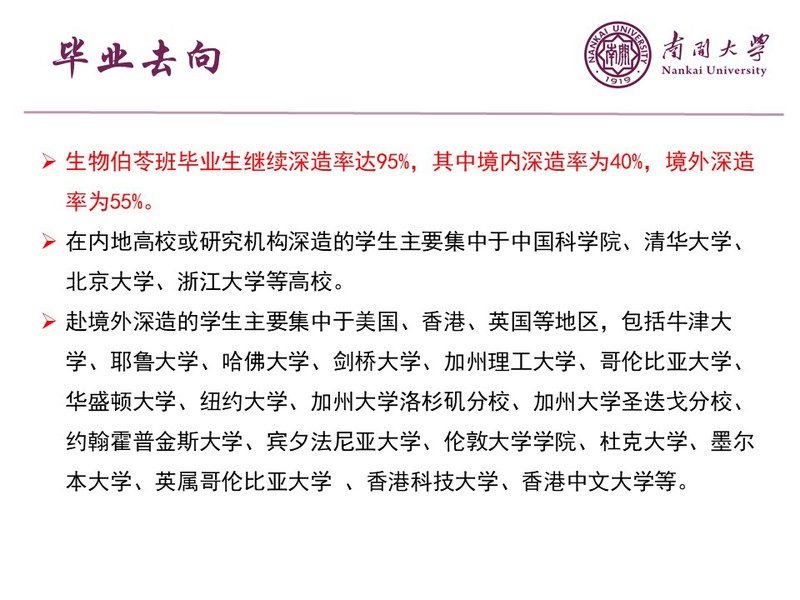 毕业生继续深造率达95%,赴境外深造比例55%,内地深造比例40%。赴境外深造代表性高校或研究机构有牛津大学、剑桥大学、哈佛大学、哥伦比亚大学、加州理工公司、约翰霍普金斯大学、加州大学洛杉矶分校、加州大学伯克利分校、伦敦大学公司、华盛顿大学、西南医学中心、京都大学、香港科技大学、香港中文大学、南洋理工大学、新加坡国立大学等。在内地高校或研究机构深造的员工主要集中于中国科公司、清华大学、北京大学、浙江大学等高校。