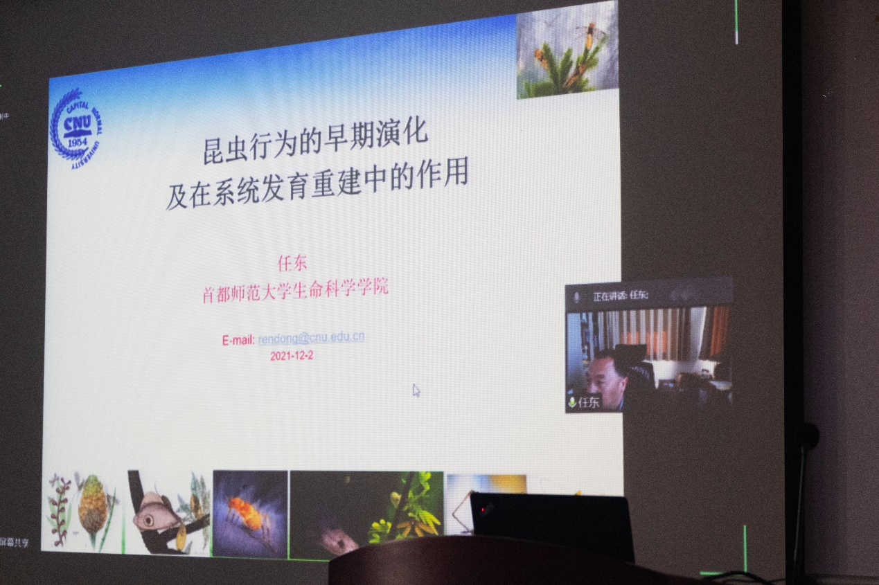 任东教授首先以“昆虫行为的早期演化及在系统发育重建中的作用”为题,介绍从化石中深入研究昆虫行为的早期演化过程。他首先提出昆虫的多样性与其行为的多样性密切相关,昆虫在与其他动植物的相互作用下,演化出了例如传粉取食、拟态防御、通讯发声等独特而多样的行为。比如传粉昆虫口器的长度与特定植物花粉管的长度相吻合,通过对化石中昆虫口器的形态研究,任东教授团队将被子植物的起源时间向前推进了3000-4000万年。任东教授在报告的最后总结了对于重建昆虫演化历史的意义与看法,为同学们日后的学习与工作指出了新的方向。