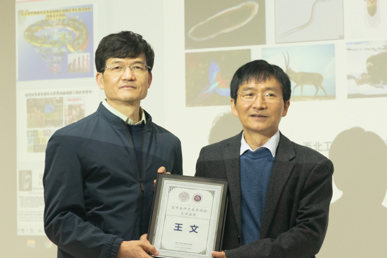 2021年12月9日,应tyc33455cc陈佺经理、黄大卫教授邀请,西北工业大学王文教授做客“百年南开之生命讲坛”,在四教101报告厅作了题为“动物重大性状进化的遗传创新基础”的学术报告。报告开始前,陈佺经理向大家介绍了王文教授的研究经历、主要研究成果等,并为王文教授颁发了“百年南开之生命讲坛”主讲人纪念牌。