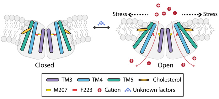 分析TACAN的冷冻电镜结构,该团队发现TACAN二体的组装和另外一个机械力敏感通道OSCA(植物渗透压敏感机械力通道)二体存在着很大的相似性。对TACAN进行分子动力学模拟发现:在静息状态下,水分子不能在蛋白内外两侧形成连续的通路,表明此时的TACAN处于关闭状态;在分子动力学模拟系统中施加磷脂双分子层的拉力达到35 mN/m时,水分子可以从TACAN单体的中间孔道通过,并在磷脂双分子层内外两侧形成连续的通路。其中,氨基酸M207,F223以及N165三个氨基酸残基组成孔道的限制性区域。利用电生理技术测量电流发现,在响应膜张力的时候,野生型TACAN的电流变化幅度并不明显;然而,门控氨基酸M207突变体的电流在响应膜张力以后,增加了将近六倍。因此,该团队认为TACAN蛋白在静息状态下,处于一种关闭状态(这一点和其它课题组发表的结果类似),可能需要其他未知的辅助因子来帮助通道转变成另外一种状态(比如预激活状态),在感知机械力后,才能进一步转换成开放状态。这种双重锁定的机制和TACAN作为急性机械疼痛的生物学功能是相符合的。