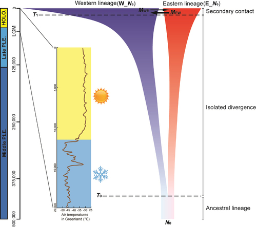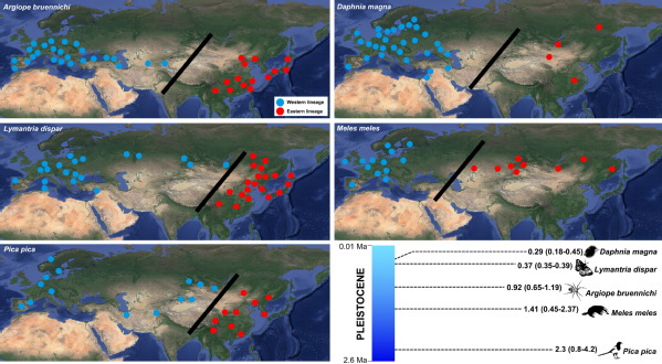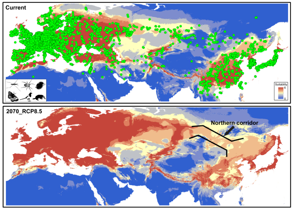 人们广泛研究了过去或未来气候变暖事件对欧亚大陆高纬度地区灭绝或现生动物类群的适宜分布区变化及种群遗传效应的影响。已有研究表明全新世气候变暖期间,由于适宜栖息地的减少,欧亚大陆高纬度地区陆生哺乳动物种群数量下降并导致了部分物种的灭绝,例如披毛犀Coelodonta antiquitatis,猛犸象Mammuthus primigenius,大角鹿Megaloceros giganteus等(Lorenzen et al. 2011 Nature; Cooper et al. 2015Science)。对于欧亚大陆高纬度地区现生的冷适应动物类群,谱系地理研究揭示出这些物种内的多数遗传支系受到全新世气候变暖的影响,导致支系遗传多样性和有效种群规模的下降(Fedorov et al. 2020 PNAS; Louis et al. 2020 Proc R Soc B)。这些已有研究成果表明全新世以来的气候变暖事件以及近年来由于人类活动排放温室气体造成的全球变暖对分布于欧亚大陆高纬度地区冷适应动物类群形成了威胁。然而,相比较这些受到关注的欧亚大陆高纬度冷适应动物类群,这一系列重大气候变暖事件对欧亚大陆中低纬度分布的温带动物类群尤其是昆虫的影响仍知之甚少。