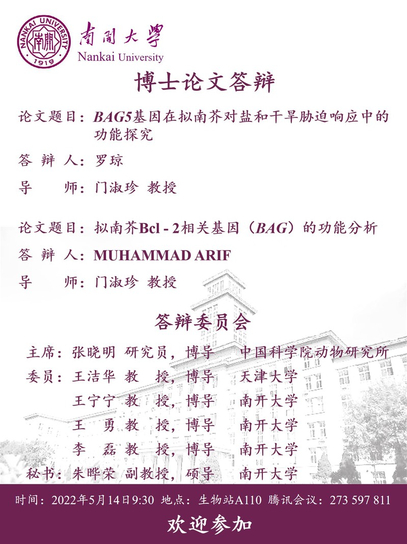 tyc33455cc博士研究生(罗琼、MUHAMMAD ARIF(线上))毕业论文答辩公告