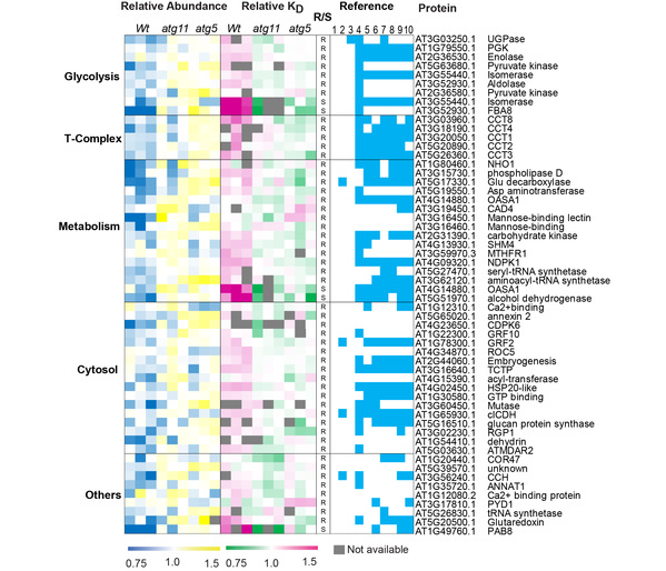 图2.新的自噬降解底物蛋白质的发现。拟南芥自噬突变体atg11和atg5与野生型相比,56种周转率降低并且丰度上升作为鉴定自噬调控的蛋白质底物。