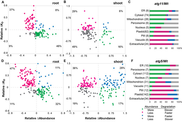 图1.自噬突变体蛋白质丰度和周转率联合分析。拟南芥自噬突变体atg11和atg5与野生型相比,可分为四种不同的蛋白质丰度和周转率变化模式,四种变化模式在细胞器和亚细胞组分分布不同。