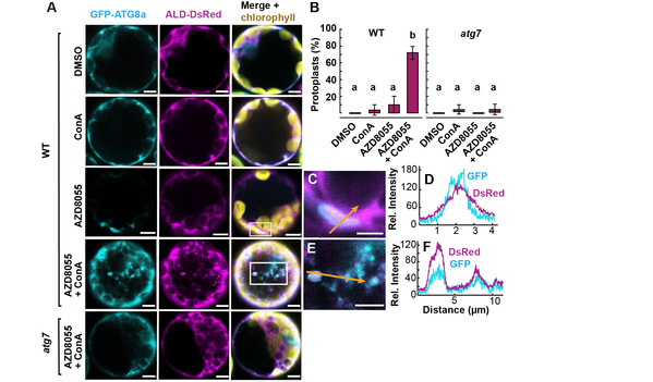 该研究进一步通过的细胞生物学和生物化学自噬底物鉴定策略,对新发现的自噬底物糖酵解酶FBA8进行了进一步验证,发现荧光标记的FBA8可以进入到自噬小体和自噬小泡中,而抑制液泡酸化的抑制剂可有效的下调其自噬降解(图3)。此外,对自噬核心蛋白质ATG5和ATG11功能失活突变体进行了比较,发现ATG11对线粒体和叶绿体的蛋白质降解具有更显著的调控作用,而在ATG5功能突变体内发现了BFA小体类特殊膜结构,表明ATG5和ATG11在自噬降解以及对细胞内其它囊泡运输途径的特异性调控,为深入研究其工作机制提供了前提。此外,该研究通下调磷含量对拟南芥进行处理,证实了磷饥饿可以有效的激活自噬,不过磷饥饿对自噬蛋白质的降解过程影响是轻微的,仅有少数蛋白质的降解被激活,可作为磷饥饿条件下的特征性靶标蛋白质用于磷缺乏相关研究。该研究综合透射电镜细胞生物学分析,蛋白质组学,代谢组学和生化分析,在模式植物拟南芥系统解析了自噬降解对蛋白质降解及其它细胞内蛋白运输和降解的调控,并对发现的新现象进行了深入的探讨,为植物细胞自噬降解调控的进一步深入机制研究提供了前提。