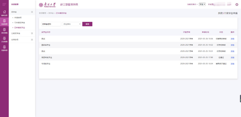 申请人登录系统后,鼠标滑动到左侧“奖惩管理”栏目,显示“奖学金”、“公能奖学金”、“荣誉称号”。如下图: