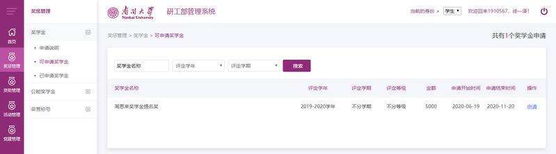 在奖学金模块中可以查看申请说明和当前可申请奖学金,本模块包含可申请有国家奖学金、周恩来奖学金、公能奖学金、专项奖学金。