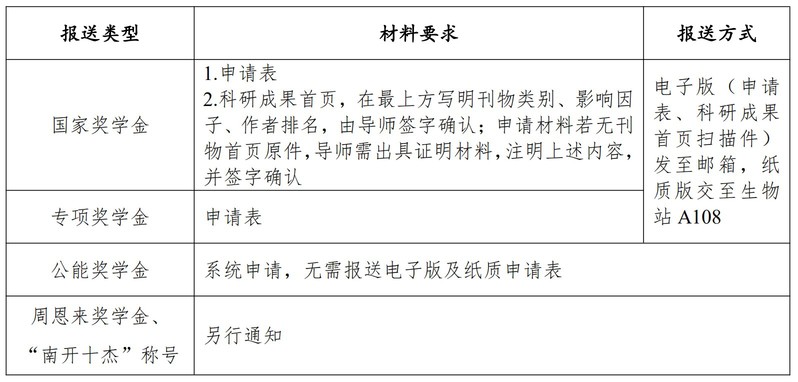 国家奖学金、专项奖学金需要在系统上完成申请并下载申请表后,将申请材料电子版发送至nkskjxjpx2022@163.com,邮件标题为“所在系+学号+姓名+申请奖项类别”,附件文件名改为“所在系+学号+姓名+表格名称”。纸质版于9月26日8:30-11:30交至生物站A108室张闫佳。