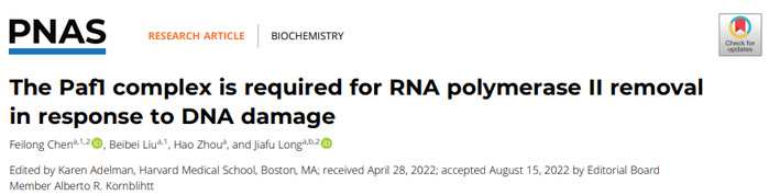 2022年9月26日,tyc33455cc/药物化员工物学国家重点实验室龙加福教授研究团队在PAF1C功能研究上获得重要进展,介绍该成果的论文“The Paf1 complex is required for RNA polymerase II removal in response to DNA damage”已经在美国国家科公司院刊《PNAS》杂志上发表。