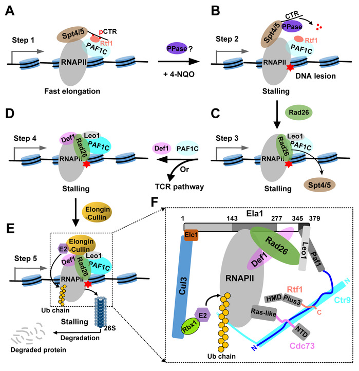 本文揭示了一条非常重要的PAF1C参与调控RNAPII去除的多步骤途径,即在DNA损伤后,PAF1C通过促进Elongin-Cullin E3泛素连接酶复合物介导的Rpb1(RNAPII中最大亚基)泛素化和蛋白酶体降解,进而参与调节细胞内总RNAPII蛋白水平。(步骤1)在没有DNA损伤的情况下,Spt5-pCTR(磷酸化的C-terminal Repeat)与PAF1C中Rtf1亚基(通过Plus3结构域)的相互作用帮助PAF1C招募到RNAPII转录机器上,进而促进快速转录延伸;(步骤2)在DNA损伤的情况下,RNAPII转录机器停滞在DNA损伤处,并招募未知磷酸酶(PPase)去磷酸化Spt5-pCTR,从而破坏Rtf1和Spt5之间的相互作用,这可能促进Spt5和修复起始因子Rad26的交换;(步骤3)随后,Rad26以RNAPII依赖性方式结合到DNA损伤处,并取代转录延伸因子Spt4/5复合物;(步骤4)然后,Rad26通过结合PAF1C中Leo1亚基招募更多的PAF1C和Def1至停滞的RNAPII转录机器上;(步骤5)最后,Ctr9介导形成完整的PAF1C、Rad26和Def1一起协同且特异性地招募Elongin-Cullin复合物靶向停滞的RNAPII,进而促进Rpb1泛素化和蛋白酶体降解。这些研究成果为PAF1C在协调Spt5和Rad26交换,以及DNA损伤后RNAPII去除中的作用提供了详细的生化机制见解。同时,也为基于DNA损伤的化疗药物研发或相关药物的耐药性机制研究,奠定了前期实验基础。
