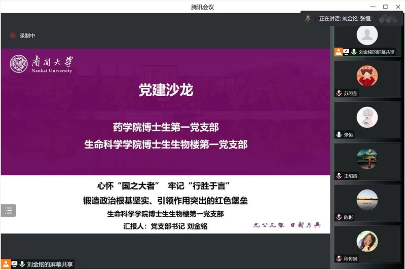 10月22日下午,tyc33455cc博士生生物楼第一党支部和药公司博士生第一党支部联合开展了“喜迎二十大 争做优秀南开人 科技强国有我在”主题党建交流沙龙,两院博士生结合二十大报告内容与自身学科特点与员工需求展开深入交流,共同探讨工作经验,明确党支部建设目标,并搭建起两院进一步合作的桥梁。
