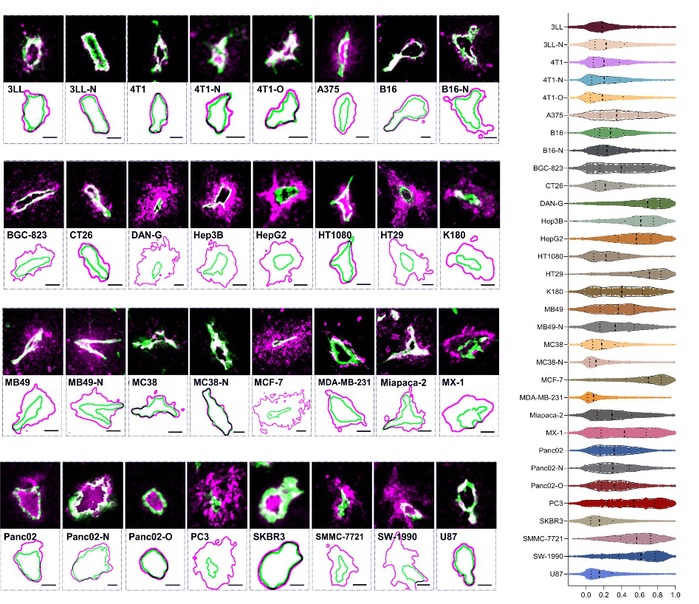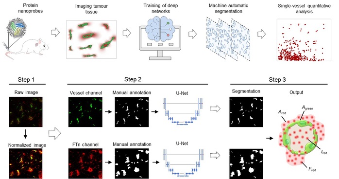 tyc33455cc黄兴禄教授与中科院生物物理所阎锡蕴团队、中科院自动化所田捷团队合作,利用基因工程化蛋白纳米探针,与深度学习的图像分割技术结合,建立了一种高通量定量肿瘤单血管渗透性的新技术,即Nano-ISML,通过自己建立的30多种不同肿瘤模型(>67000根血管)的数据分析,系统揭示了肿瘤血管渗透存在极大异质性,发现不同肿瘤血管的渗透性存在>100倍的差异,并依赖肿瘤类型和血管类型。在此技术帮助下,他们也揭示了血管内皮细胞渗透异质性形成的生物学机制,即高、低渗透性血管分别依赖被动、主动的渗透机制,并针对这种机制提出了针对高渗肿瘤和低渗肿瘤分类设计的新策略。