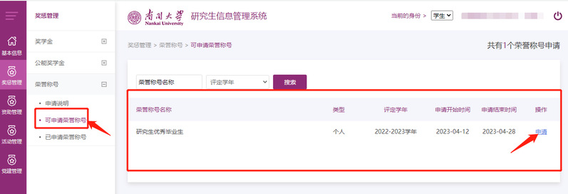 员工可在研究生信息管理系统(网址为:yjsxsgl.nankai.edu.cn)奖惩管理模块下的荣誉称号菜单点击选择研究生优秀毕业生进行申请,填写信息并提交。