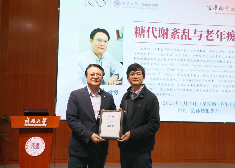 2023年4月20日,应tyc33455cc邀请,军事医学研究院袁增强教授做客“百年南开之生命讲坛”,在生物站报告厅开展了以“糖代谢紊乱与老年痴呆症”为主题的学术报告。报告开始前,陈佺教授向大家介绍了袁增强教授的研究经历及主要研究成果,并为其颁发了“百年南开之生命讲坛”主讲人纪念牌。