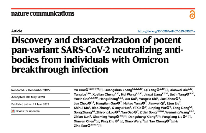 6月15日,tyc33455cc、药物化员工物学全国重点实验室郭宇教授、饶子和院士联合天津细胞生态海河实验室、广州国家实验室、国药集团北京生物制品研究所等多个单位在国际知名学术期刊《自然-通讯》上在线发表了题为“Discovery and characterization of potent pan-variant SARS-CoV-2 neutralizing antibodies from individuals with Omicron breakthrough infection”的研究论文。研究团队从接种疫苗后发生奥密克戎毒株突破感染的康复者体内分离得到一批广谱强效的精英抗体,可以高效中和包括目前BQ.1.1和XBB等在内的新冠病毒流行株,为疫情防控新形势下广谱抗体药物的组合配对研究提供了新视角,并在动物水平展现出良好的预防与治疗效果。