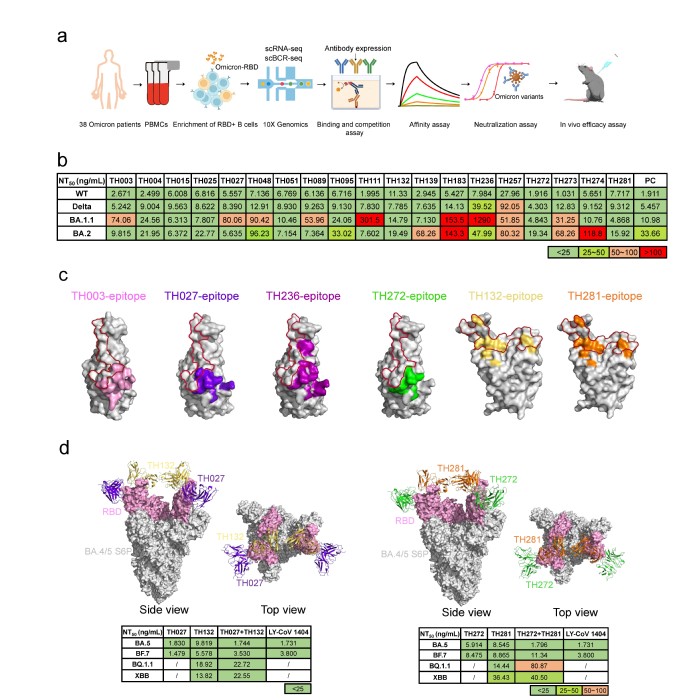 基于精确的三维结构结构信息和人工智能辅助的病原体进化预测,研究团队在2022年6月分离选定的这批精英抗体,对此后一年多以来陆续出现的BF.7, BQ.1.1和XBB等变异株均保持了高亲和力和高效的中和活性,展现出良好的成药潜力。