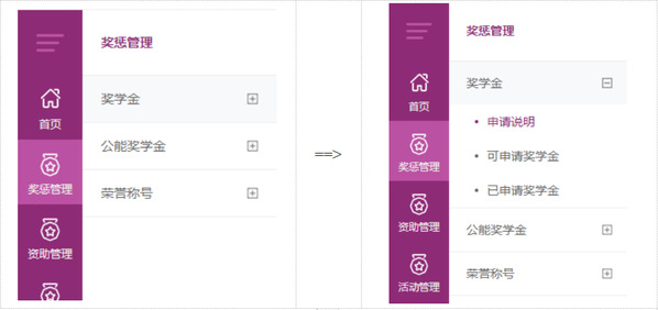 申请人登录系统后,鼠标滑动到左侧“奖惩管理”栏目,显示“奖学金”、“公能奖学金”、“荣誉称号”。如下图: