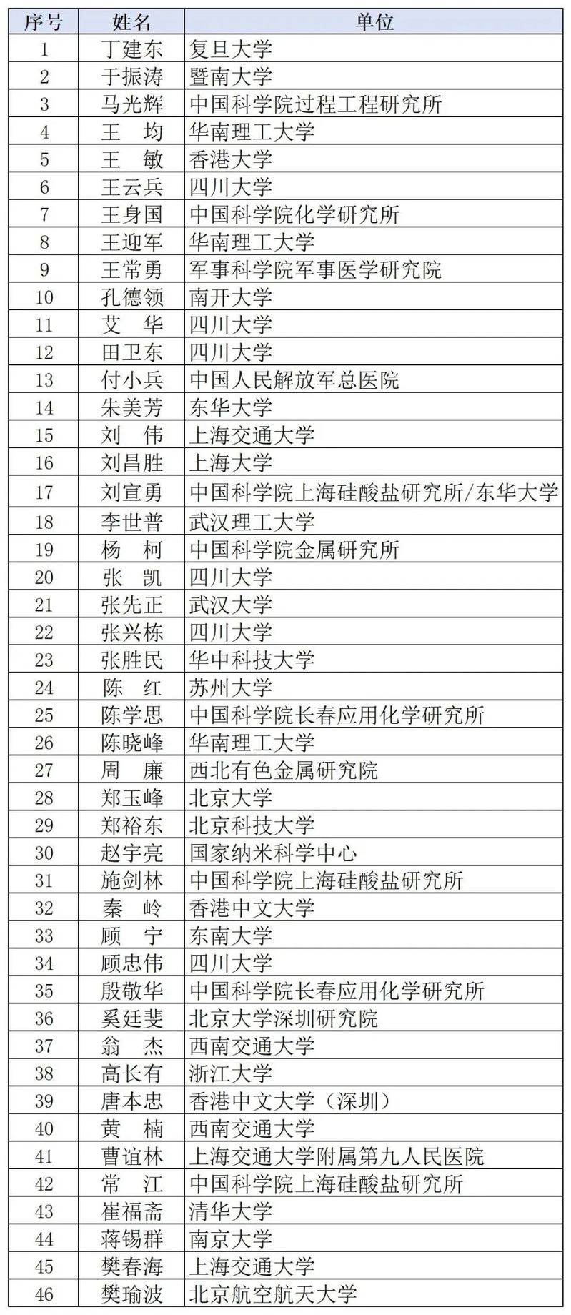首届中国生物材料学会会士当选名单(按姓氏笔画排序)