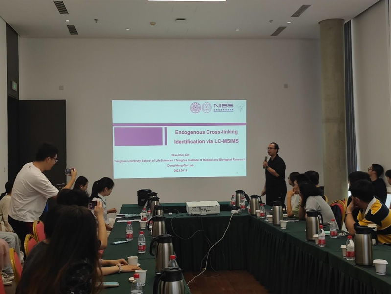 在随后的科研分享交流环节,清华老员工物医学交叉研究院/北京生命科学研究所董梦秋课题组的信树辰同学带来题为Endogenous Cross-linking Identification via LC-MS/MS 的学术分享,利用液相色谱-质谱联用技术鉴定可能存在的内源交联形式。他们发展了脂质-蛋白交联和三肽交联的鉴定技术,有望揭秘各种疾病潜在的生物学机制。