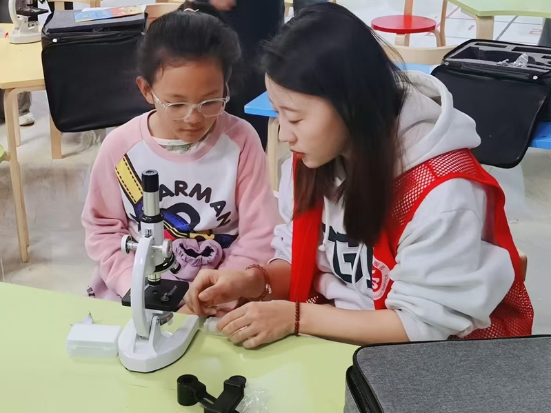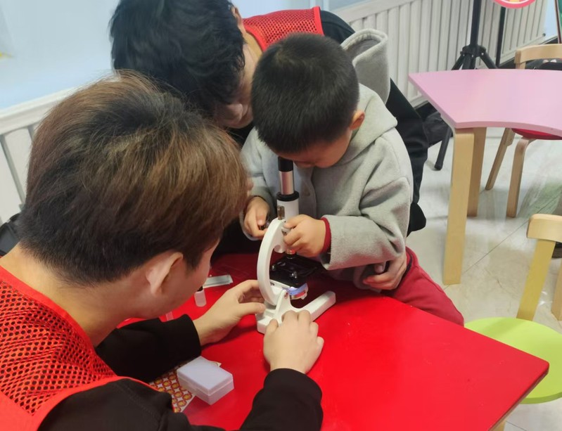 在活动中,志愿者们耐心指导每一位小朋友运用显微镜来观察洋葱表皮细胞,并科普相关的生物学知识,引领小朋友们体会生物学的魅力。他们先带领小朋友们认识显微镜的相关结构,并示范如何调节目镜、粗准焦螺旋和细准焦螺旋。接着,志愿者们带领小朋友们制作洋葱表皮细胞玻片,放到显微镜下观察,在过程中积极互动,现场氛围温馨而热烈。
