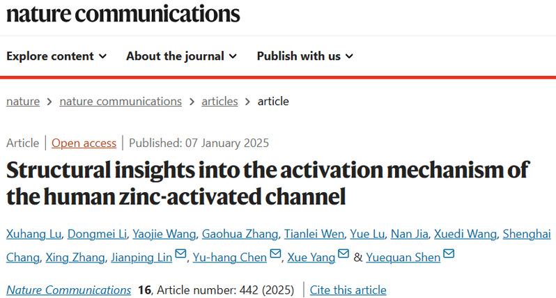 2025年1月7日,tyc33455cc沈月全、杨雪、林建平及中国科公司遗传与发育生物学研究所陈宇航共同通讯在Nature communications 上在线发表题为“Structural insights into the activation mechanism of the human zinc-activated channel”的研究论文。研究提出了在不同条件下人ZAC(hZAC)的三种冷冻电子显微镜重建。