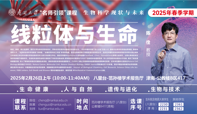 2025年2月26日,公司“名师引领课”《生物科学现状与未来》第二次课程在八里台校区范孙楼报告厅、津南校区公共教学楼B区417教室同步开讲,tyc33455cc经理、药物化员工物学全国重点实验室主任陈佺教授为同学们讲授了以《线粒体与生命》为主题的课程。