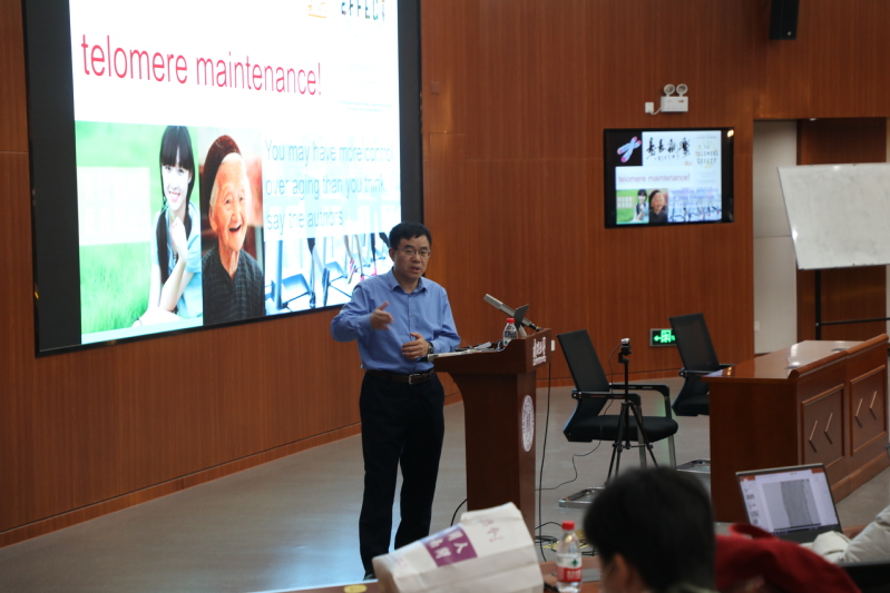 课堂伊始,刘林教授首先向同学们介绍了衰老的基本概念及影响因素。并从课程主角“端粒”的概念入手,阐明端粒是位于染色体末端的DNA重复序列,保护了染色体和基因组稳定性,而端粒的维持机制离不开端粒酶,端粒酶的缺陷可以导致端粒功能障碍,进而引起细胞衰老和肿瘤的发生。