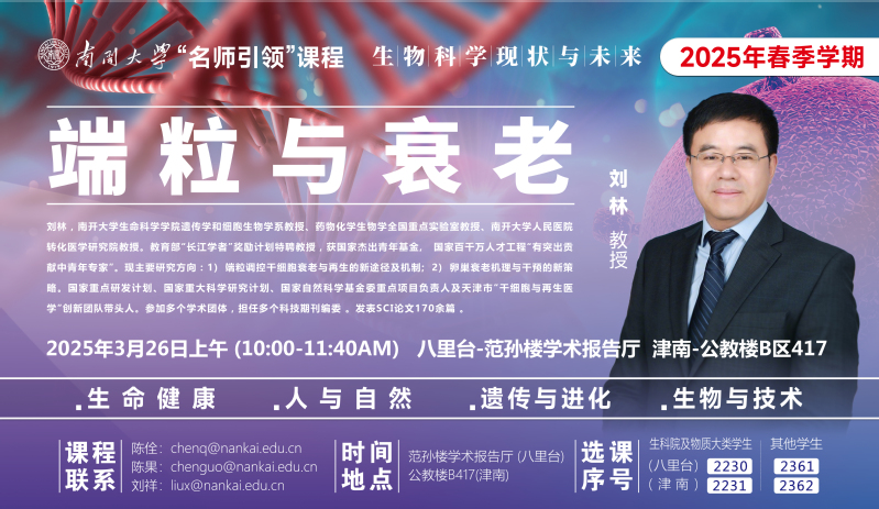 2025年3月26日,刘林教授走进公司“名师引领课”《生物科学现状与未来》的课堂,为全院师生带来课程的第六讲“端粒与衰老”,刘林教授讲课条理清晰,深入浅出,清楚地揭示了染色体端粒与人类健康和衰老的重要关系。