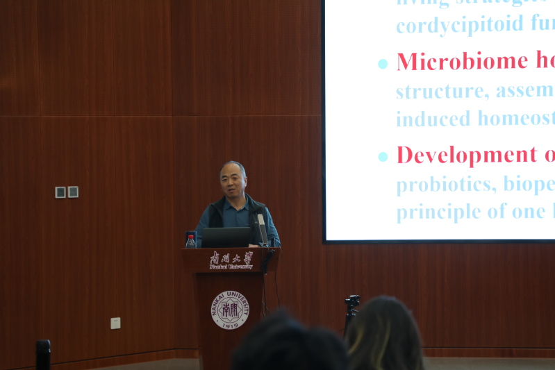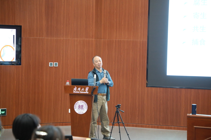 课程的后半部分,刘老师从共生真菌的角度,以虎杖象甲培植真菌为例介绍了植菌昆虫和培植真菌从特异结构到行为的共生关系以及培植真菌如何为昆虫提供营养及其机制,以冬虫夏草为例介绍了与宿主协同进化的免疫双向调节作用,以总状毛霉为例介绍了肠道真菌的益生作用以及在疾病治疗方面的应用价值。最后,刘老师由“允公允能,日新月异”的南开精神展开阐发,激励同学们在从事科研工作的过程中“大胆假设,小心求证”,要有创新意识,培养批判性思维,努力成长为新一代南开英才。