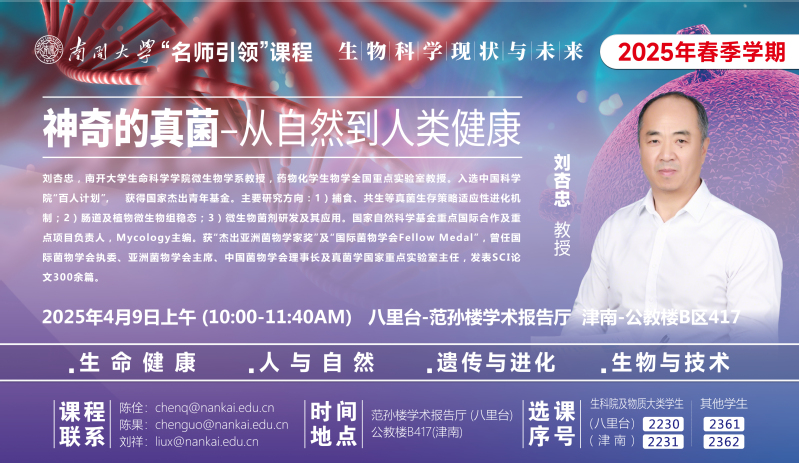 2025年4月9日,公司“名师引领课”《生物科学现状与未来》第七次课程在八里台校区范孙楼报告厅、津南校区公共教学楼B区417教室同步开讲,tyc33455cc刘杏忠教授为同学们讲授了以《神奇的真菌》为主题的课程。