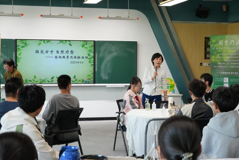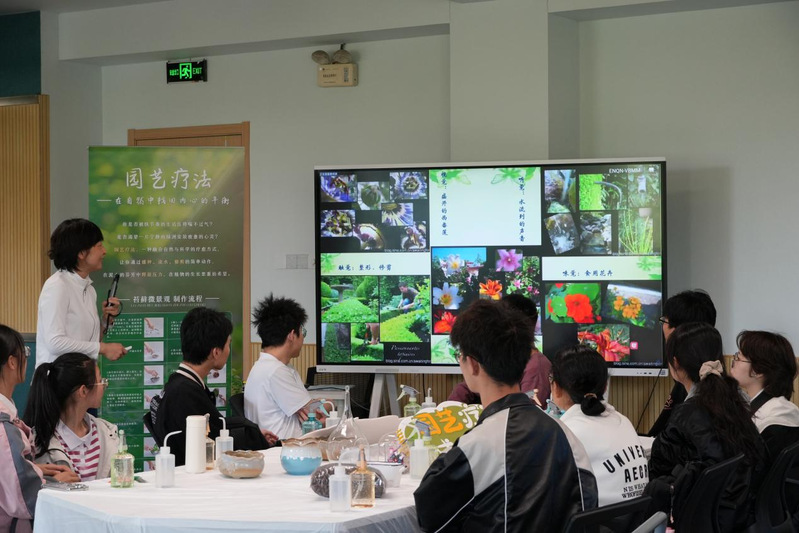 李永玲首先讲解了园艺疗法的科学概念及其发展历程,通过鲜活案例,阐述了植物与人类心理健康的紧密联系。为增强直观体验,李老师精心搭建了“五感花园”,让同学们用五感近距离感受与接触大自然。